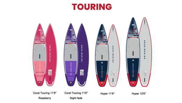 Řada TOURING je určená pro jezdce, kteří chtějí na svých vyjížďkách ukrojit trochu delší vzdálenost. Tato kategorie SUP je stále více populární a tak jsme byli zvědaví, jaký progress udělala AQUA MARINA na tomto poli. Opět se jedná o designově perfektně zpracovaná prkna, která vám na první pohled padnou do oka a vypadají velmi luxusně. Na výběr jsou dvě barevné verze dámského touringu CORAL( obě mají stejný rozměr 11'6"x31"x6" ) a dva pánské modely HYPER ve dvou velikostech 11'6"x31"x6" a12'6"x32"x6".