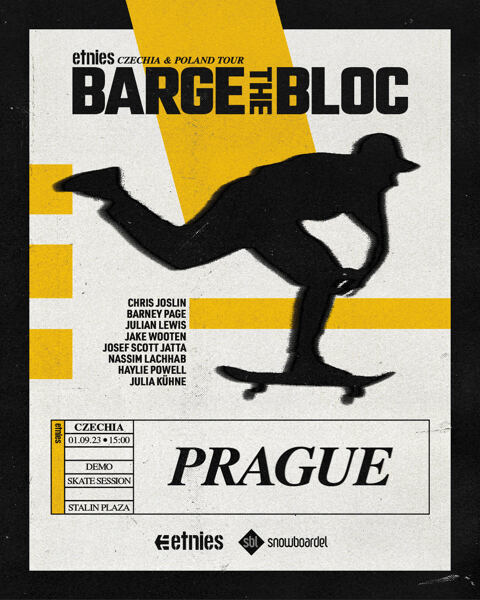 Dobrých zpráv není nikdy dost! Již za pár dnů 🗓 1.9.2023 od 15h se na pražském Stalinu představí v rámci tour Barge The Bloc našlapanej tým Etnies, kde nebudou chybět ani ty top hvězdy jako je 📣 CHRIS JOSLIN, JAKE WOOTEN, BARNEY PAGE nebo NASSIM LACHHAB! Z našich řad tým doplní  MARTIN PEK. Doražte na Stalina mrknout na světovou skejtovou špičku - vstupné je zcela zdarma