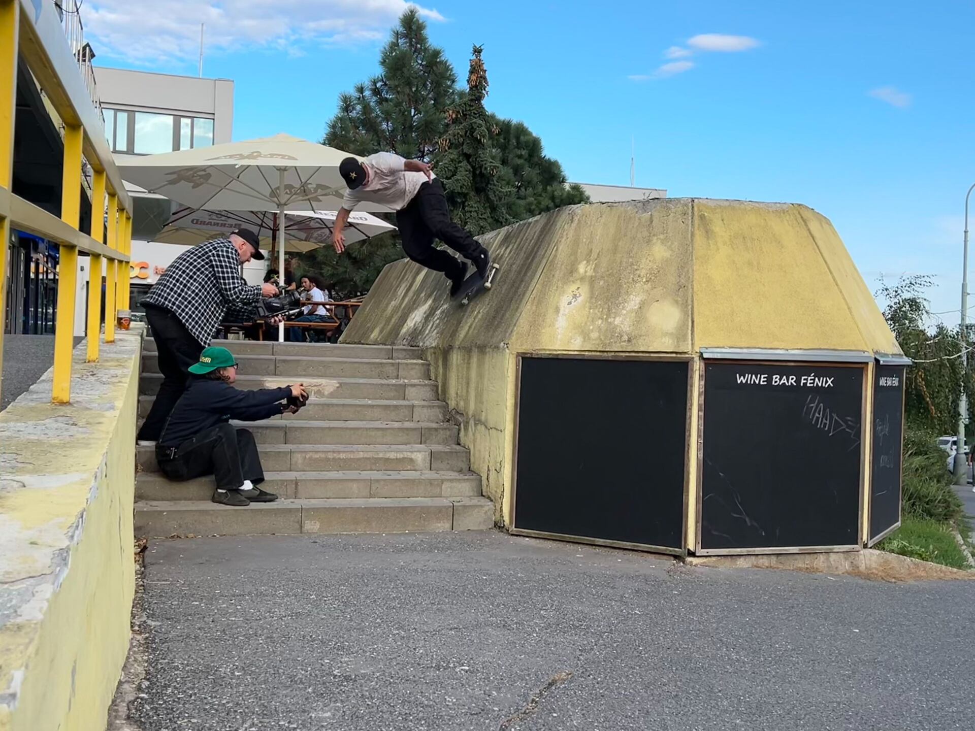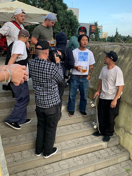 nChris však na sobě nenechává znát ani trochu únavy a bez rozmyslu odpovídá, že by se raději rovnou připojil ke zbytku týmu. Ten se zrovna nachází na spotu v Řepích vedle obchodního centra. Na místě jsme za pár minut a mně se naskýtá pohled, který moje hlava nestíhá zpracovat. Nacházíme se na nenápadném sídlišti, kam jsem jako malý kluk chodil na kroužky a obrážel místní spoty s kamarády. Teď tu před malou vinárnou stojí komplet Etnies tým a společně se hecují do wallridu z osmiček. Právě na tomto spotu nám Chris ochotně věnoval pár minut svého času na krátký rozhovor.