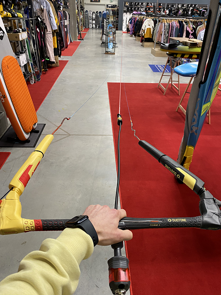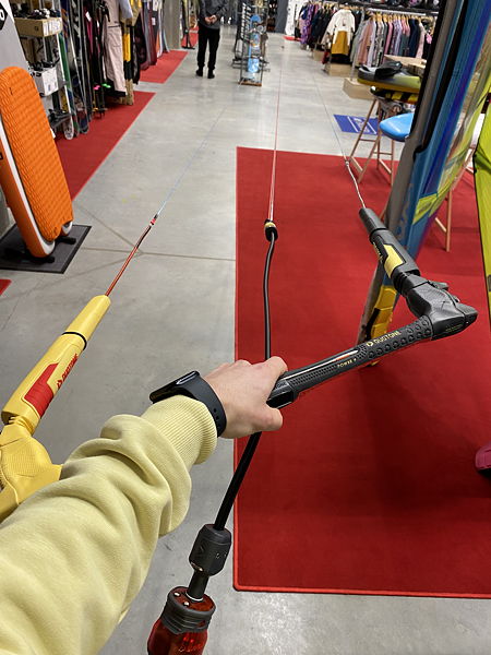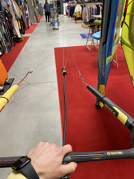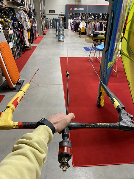 Na Duotone Trust baru měníte délku řídicích lajn, a tímto srovnáváte celý bar. Stačí otevřít plastové kryty na stranách baru a navázat na správné uzlíky tak, aby všechny lajny byli srovnané.