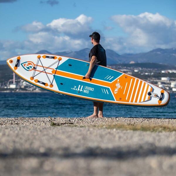 SKIFFO Sun Cruise 11'2" je univerzální nafukovací paddleboard z kategorie Touring. Díky svému tvaru a nosnosti je Sun Cruise ideální pro různé aktivity, od klidných projížděk po hladině až po delší výlety a zábavu s celou rodinou. Je vhodný i pro začátečníky, díky širokému tvaru a tloušťce 6" zajišťuje výbornou stabilitu, takže se budou cítit sebevědomě. Vysoká nosnost až 150 kg pak dělá tento SUP vhodným pro jezdce s těžší váhou, nebo pro jízdu s dětmi a psími parťáky. Sun Cruise je vyroben technologií MSL-Fusion s DROP-STITCH vlákny uvnitř, která zajišťuje jeho lehkost, tuhost a odolnost. Na palubě se nachází kovové D-kroužky, ke kterým lze připevnit kajakovou sedačku, která je součástí setu.
