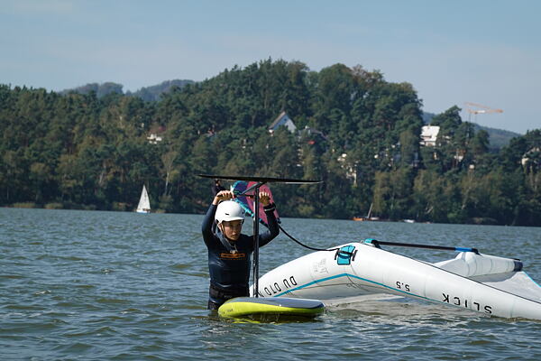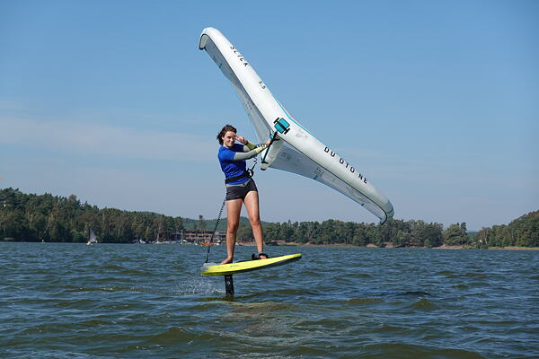 Oba dny jsme zahájili den rozcvičkou, kterou vedla Eliška Jelínková, po rozcvičce následovala teorie na břehu pod vedením Pauly a poté jezdící část účastníků šla rovnou na vodu. Část začátečníků začínala s teorií ovládání wingu na břehu a ve vodě a postupně se propracovávali ze SUP na plováky s foilem.