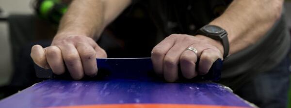 Jakmile vosk zaschl a nechali jste jej odpočinou, je na čase začít škrábat. Vezměte plastovou škrabku pod úhlem 45° a pečlivě začněte škrábat přebytečný vosk souvislým tahem směrem od špičky k patce. Dlouhé a plynulé tahy jsou klíčem k hladké skluznici. Zkontrolujte, že Vám nezůstal žádný vosk na hranách.