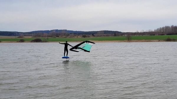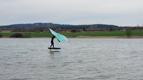 Wingboard jsem testoval s foilem NSP, který má plochu předního křídla 1700cm2. Tento foil se vyznačuje vzletem již v nízké rychlosti, což je na nafukovací wingfoilboard nutnost. Začátek je stejný jako na klasickém wingboardu, nejdříve na kolena, wing nad hlavu a jen co se malinko rozjedete, tak se postavíte, nejdříve na přední nohu a pak na zadní. S tímto foilem bylo na rozjezd potřeba si stoupnout malinko více dopředu, tak aby se boardu tolik nenořila záď a přešel bez problému do levitace. Pokud se wingboardem dotknete hladiny, tak nemějte strach, nebudete katapultováni dopředu, trochu více se zbrzdíte než na klasickém pevném wingboardu, ale budete pokračovat dál v jízdě.