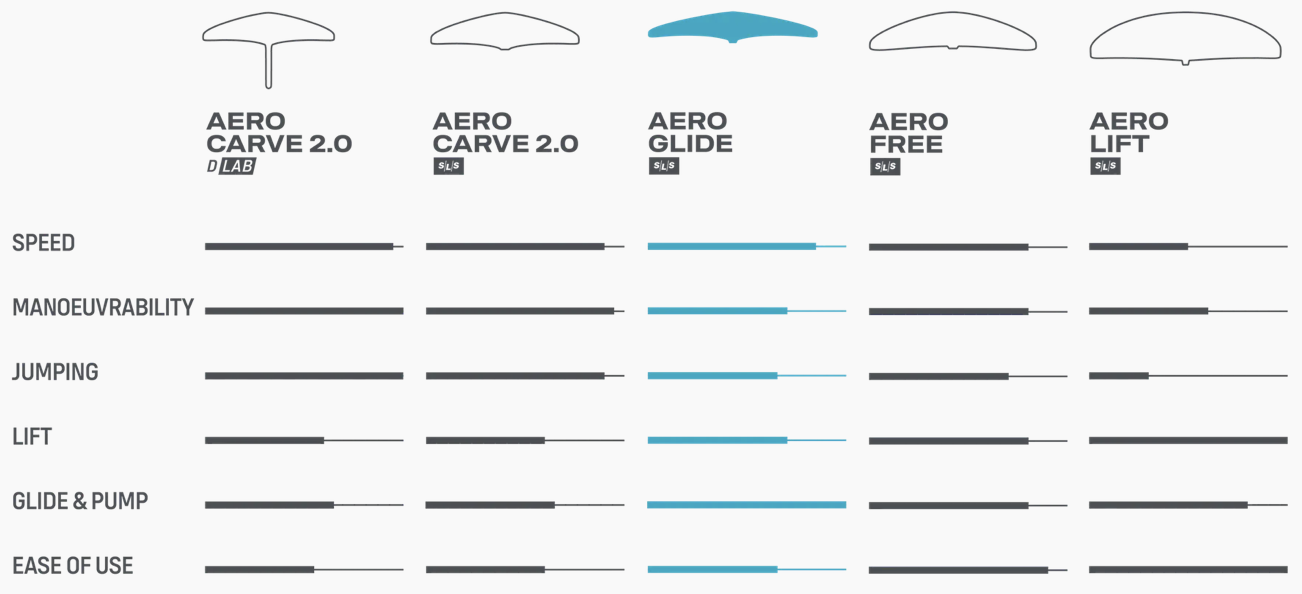 AERO GLIDE SLS jak už název napovídá, je určen hlavně na glide, pumpfoiling, wingfoiling do slabého větru a downwind ježdění na vlnách, dobrá ovladatelnost je samozřejmostí. Velké aspect ratio předurčuje tento foil k překonávání velkých větrných děr s obrovskou efektivitou. Malé velikosti od 729-1305 mají aspect ratio 9,5. Jsou to rychlé křídla s malým odporem. Velikost 1595 s rozpětím 130cm je vhodná hlavně na downwind foiling, nebo do super slabého větru. Velikost 2145 s rozpětím 143 je určená hlavně na pumpfoiling.