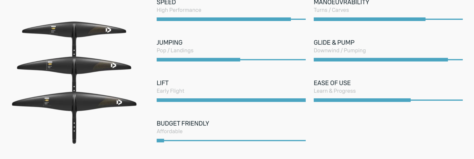 Dostupné velikosti: 620 cm², 750 cm² a 900 cm². Tato křídla jsou identická ve tvaru s variantami SLS, avšak konstrukce D/LAB snižuje celkovou hmotnost a výrazně redukuje odpor, což je činí ideální volbou pro náročné foilingové nadšence hledající špičkový výkon.