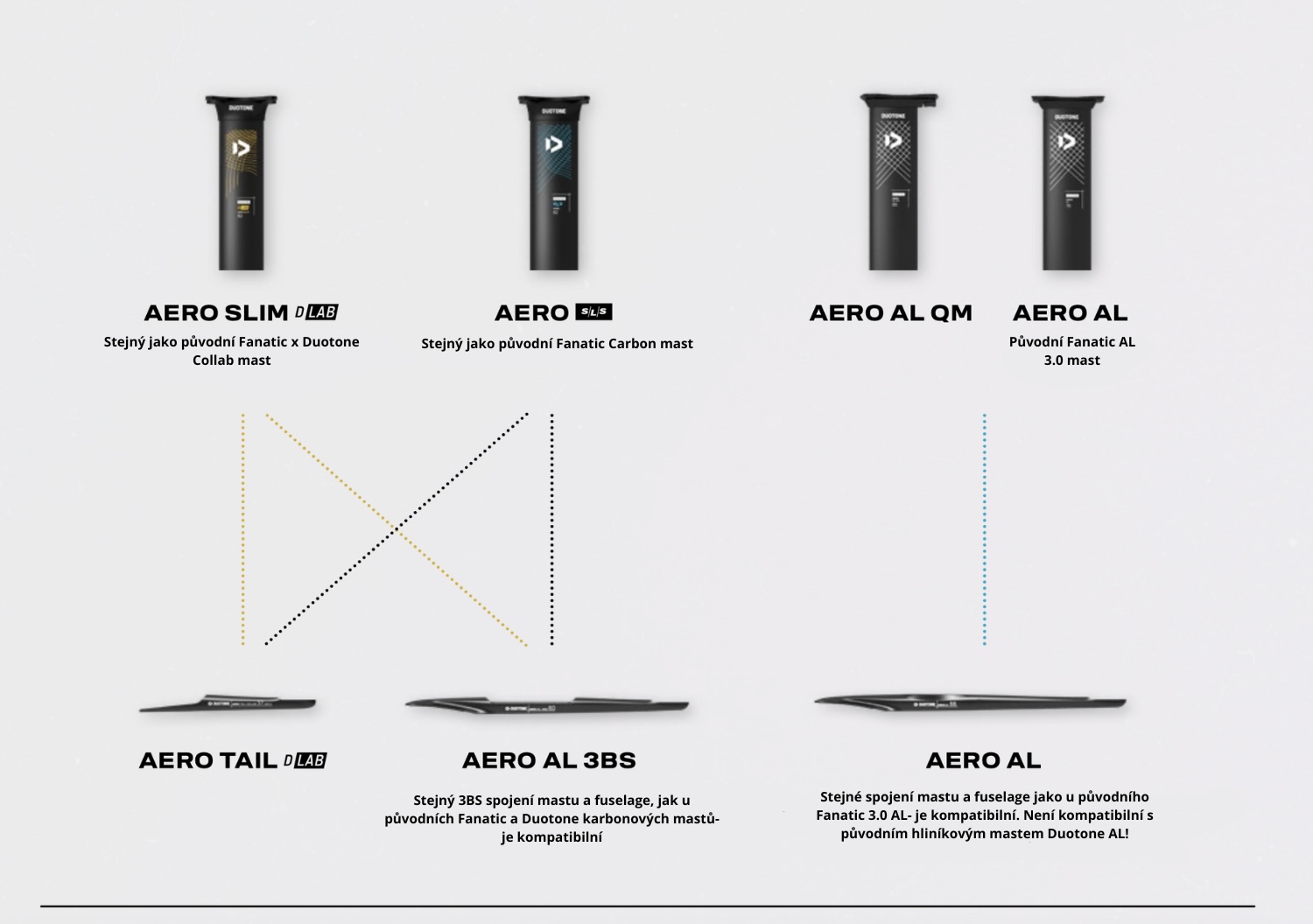 Kompatibilní s aktuálníma DUOTONE a předchozíma FANATIC křídlama, při použití Duotone fuselage aero AL.