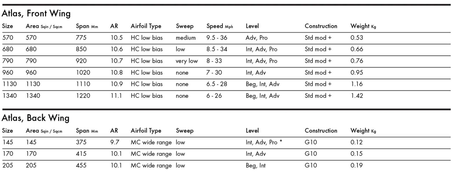 Díky jedinečnému profilu s vysokému camber zakřivení, včasnému vztlaku a odolnosti vůči ztrátě vztlaku se doporučuje zvolit velikost o 10–20 % menší ve srovnání s jinými foily na trhu.