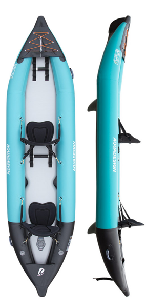 Nafukovací kajak Aquadesign Koloa 360 je univerzální turistický kajak pro dvě osoby. Lze využít jako plážový, mořský, jezerní nebo říční kajak do třídy WWIII. Ideální pro dvě osoby, tento nafukovací kajak má 10 cm silné dno Dropstitch, které lze nafouknout až na tlak 10 PSI, tedy ultra pevné dno. Na dně nalezneme v zadní části 4 odtokové ventily a místo na dvě vyndavací Slide-in ploutvičky.