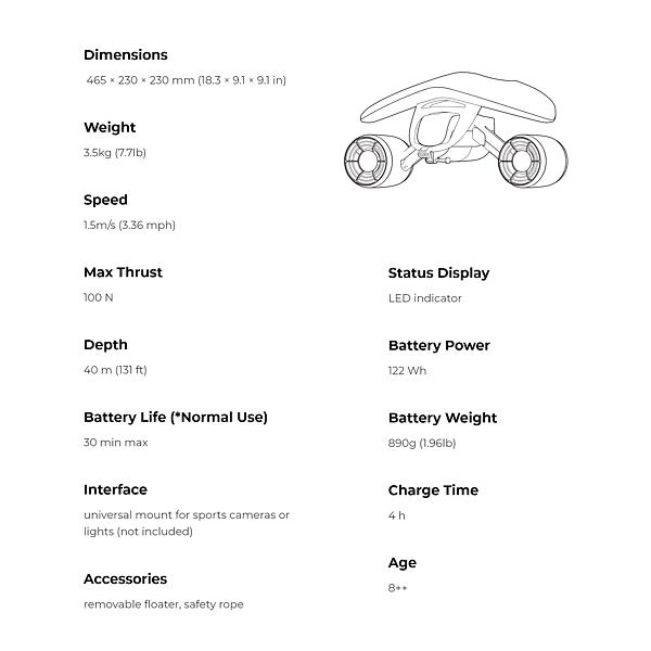 Dva elektrické motory poskytují stabilní a plynulý tah pod vodou. Maximální rychlost dosahuje až 5 km/h, což umožňuje snadné a rychlé přesuny při šnorchlování nebo potápění.