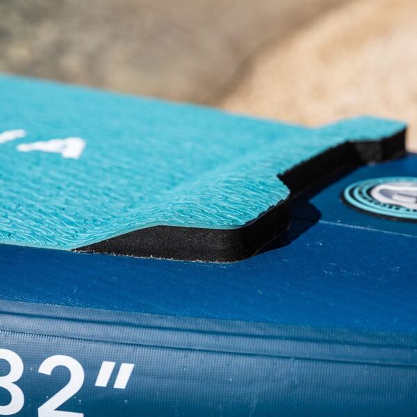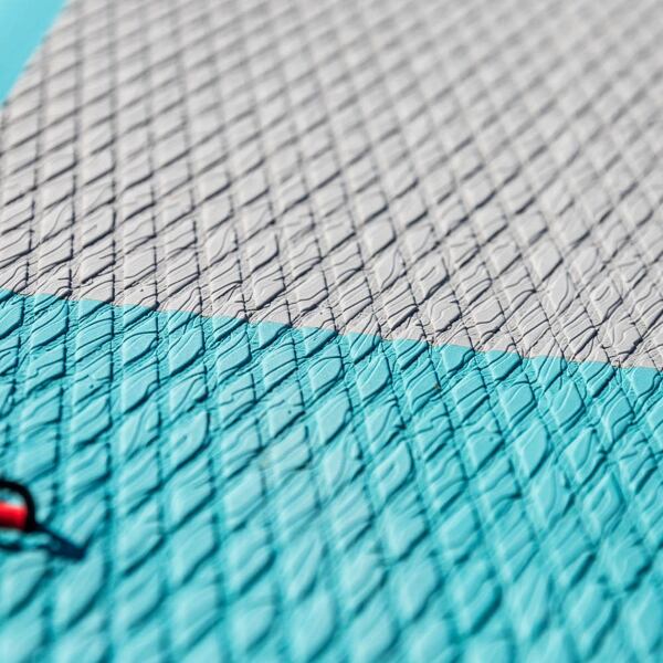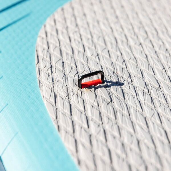 Auf dem Deck des Paddleboards befindet sich ein gefrästes, rutschfestes Pad mit DIAMANT-Muster. Dank seiner geschlossenen Struktur nimmt es keinen Schmutz auf. Am hinteren Ende des Pads befindet sich eine erhöhte Kante, die das hintere Bein bei Kurven stützt. Auf dem Deck finden Sie außerdem einen zentralen Griff und D-Ringe zur Befestigung eines Kajaksitzes. Neu ist auch das System zur Befestigung von persönlichen Gegenständen am Bug. Es besteht aus flachen RED STRAP™ -Gummibändern, die auf einer größeren Fläche neu gefaltet sind. Das sieht nicht nur gut aus, sondern ist auch sehr funktional.