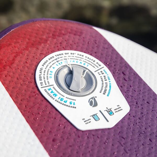 Vysokotlaký ventil pro foukání a vypouštění tlaku SUP s doporučenými hodnotami tlaku. Maximální tlak je 15 PSI..