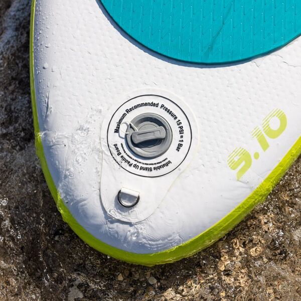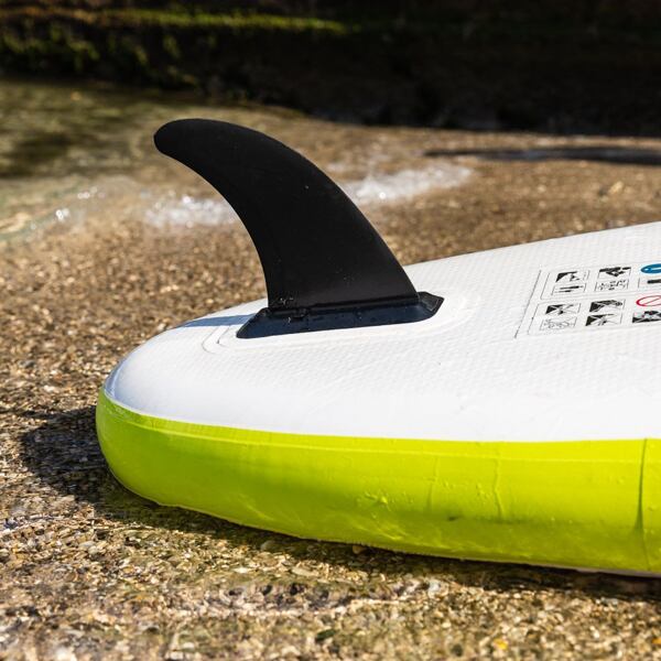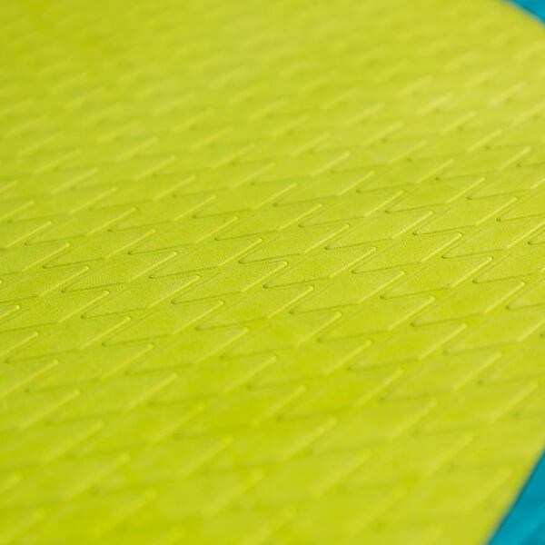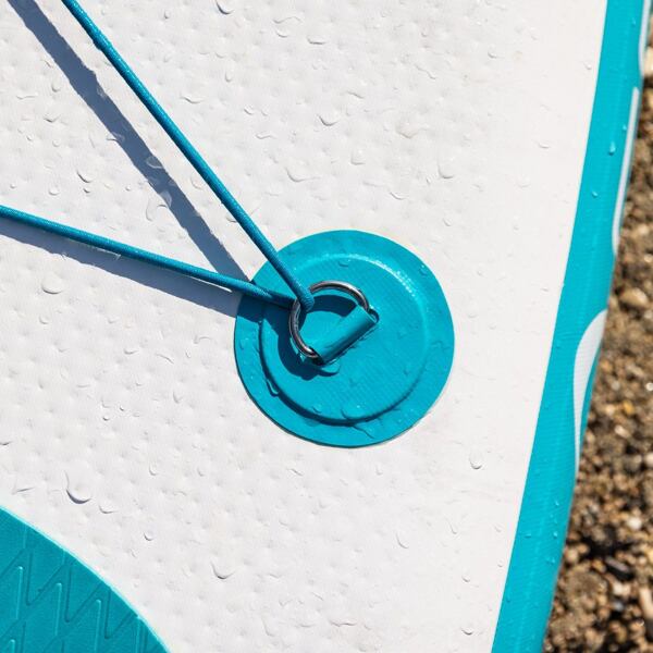 Das Paddleboard wird mit einer robusten, einlagigen Drop-Stitch-Technologie hergestellt, die die Struktur des Schwimmbretts steif, langlebig und im aufgepumpten Zustand leicht macht.