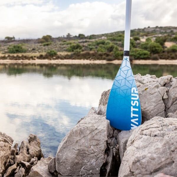 Lehké, trojdílné skládací pádlo na paddleboard od značky WATTSUP. Vyrobeno z kombinace sklolaminátu a karbonu, tedy konstrukce, která nabízí vysokou pružnost a dobrý přenos energie záběru do pádla.