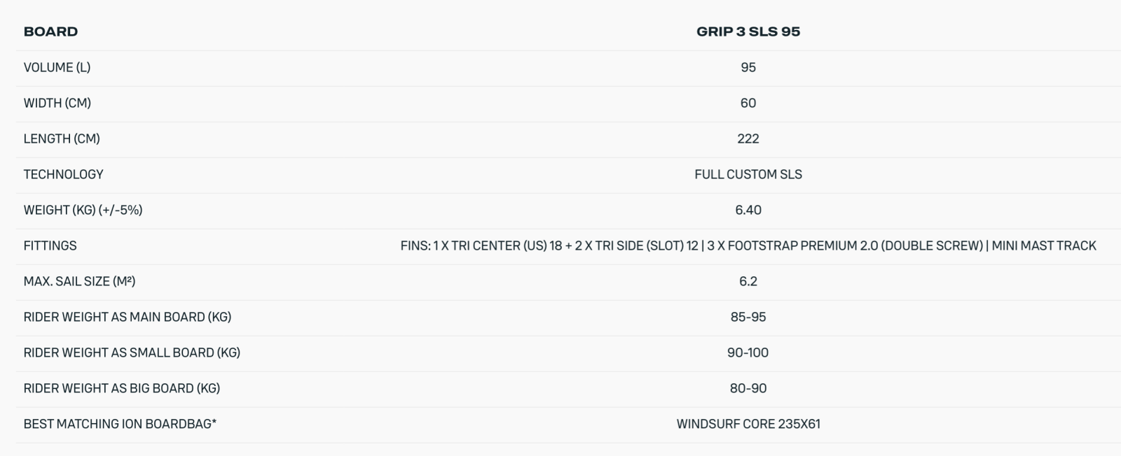 Konstrukce SLS (Strong Light Superior) využívá CNC frézované EPS jádro v kombinaci s lehkou a pevnou laminací, což vede k nízké hmotnosti při zachování vysoké torzní i podélné tuhosti. Výsledkem je rychlá odezva desky, lepší přenos energie z jezdce a vyšší odolnost při intenzivním wave použití. Mini mast track a odlehčené boxy pro flosny snižují hmotnost v klíčových oblastech a přispívají k lepšímu vyvážení desky.