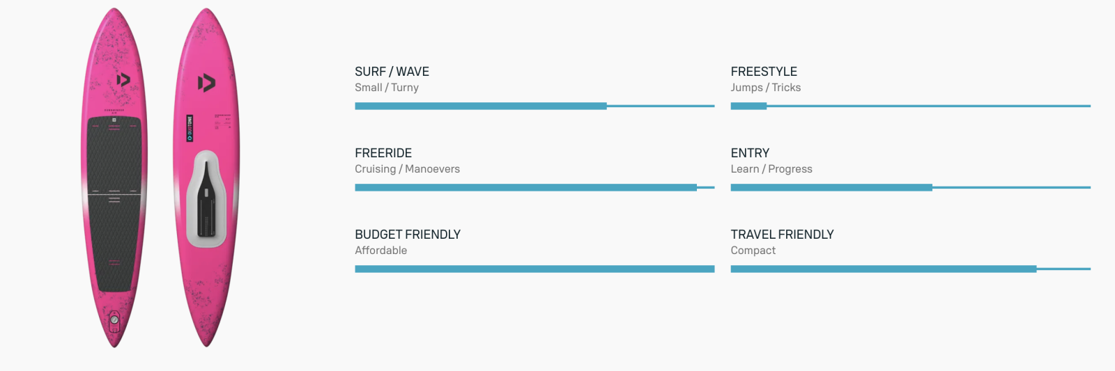Duotone Downwinder Air je nafukovací foilboard určený především pro SUP downwind foiling a wing foiling v lehkém větru. Board kombinuje vysokou efektivitu při pádlování s výhodami nafukovací konstrukce – nízkou hmotností, vysokou odolností a snadnou přepravou. Díky prodlouženému a užšímu tvaru nabízí vyšší rychlost při pádlování a rychlejší nástup do letu na foilu.