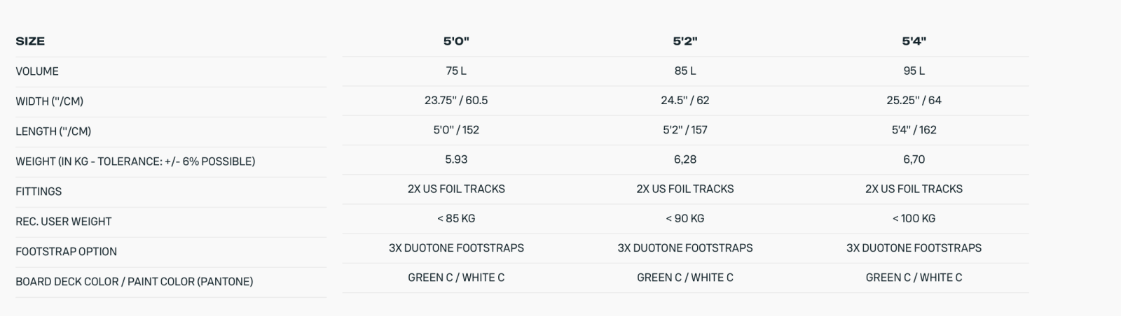 (Board je dostupný ve třech velikostech – 5'0" (75 l), 5'2" (85 l), 5'4" (95 l))
